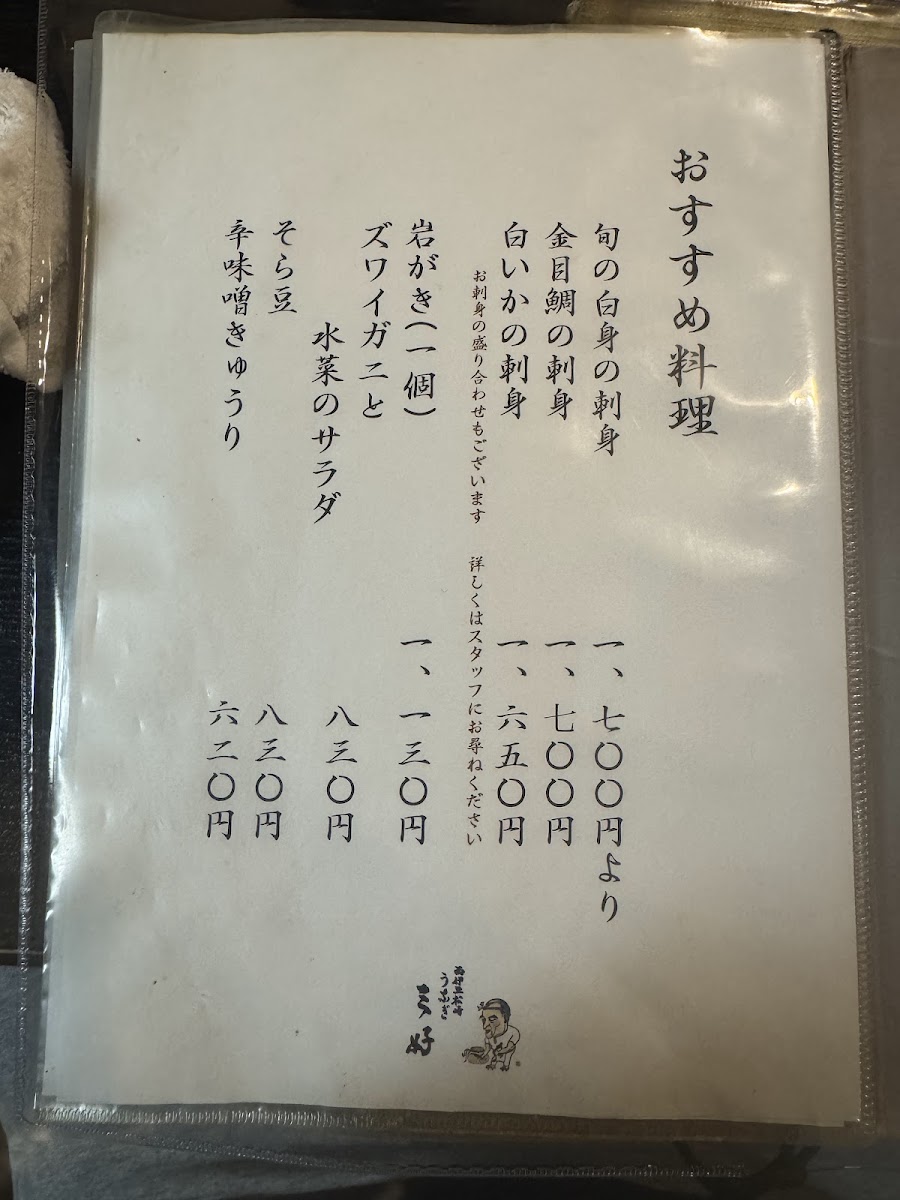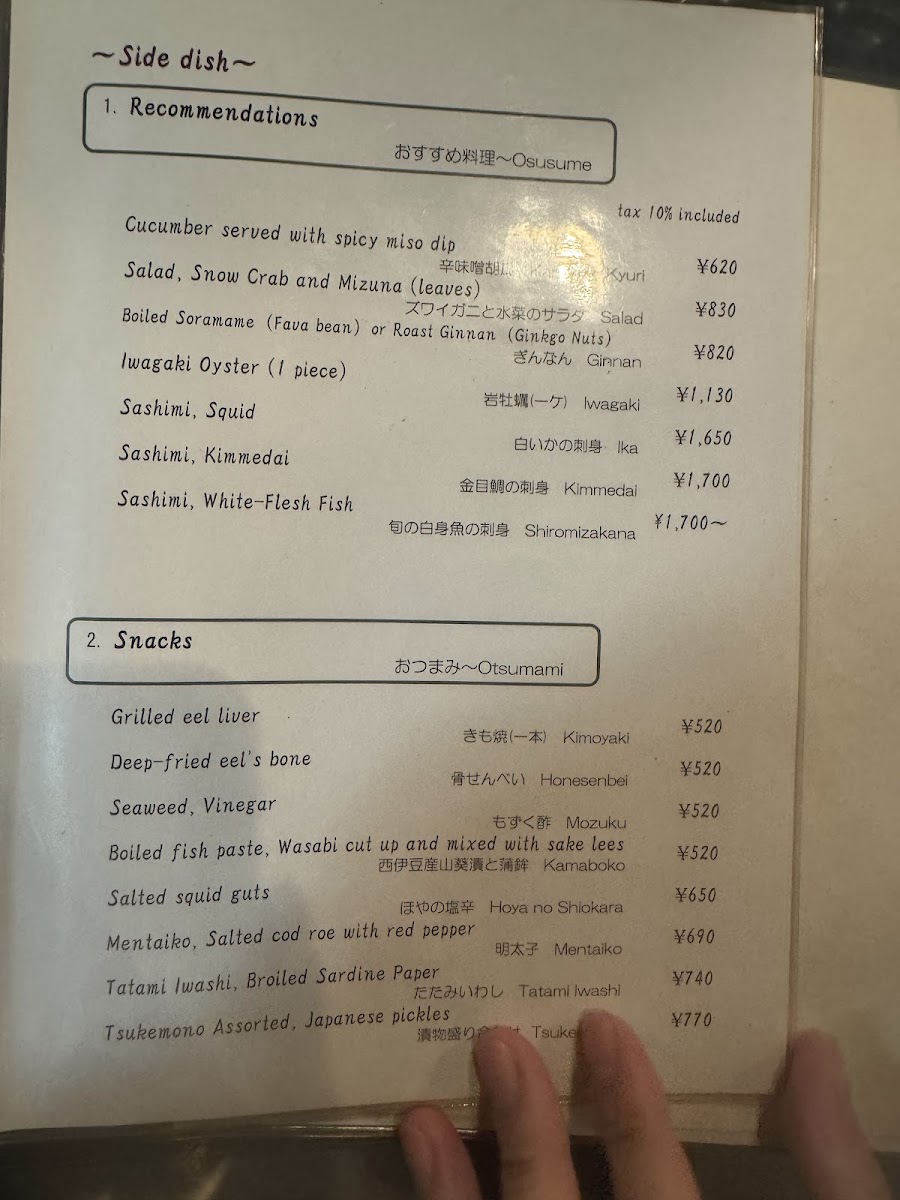 For a more unique experience, the restaurant offers Raw Shirasu Fish Fry Seasoned with Grated Ginger and Soy Sauce, a refreshing and savory option that highlights the delicate texture of the raw fish. The Small Size Tsukemono (pickles) provides a delightful contrast to the richness of the eel dishes, balancing the meal with its tangy bite. Another excellent choice for those who enjoy seafood is the 白いか刺身 (sashimi of white squid), known for its clean and tender texture.