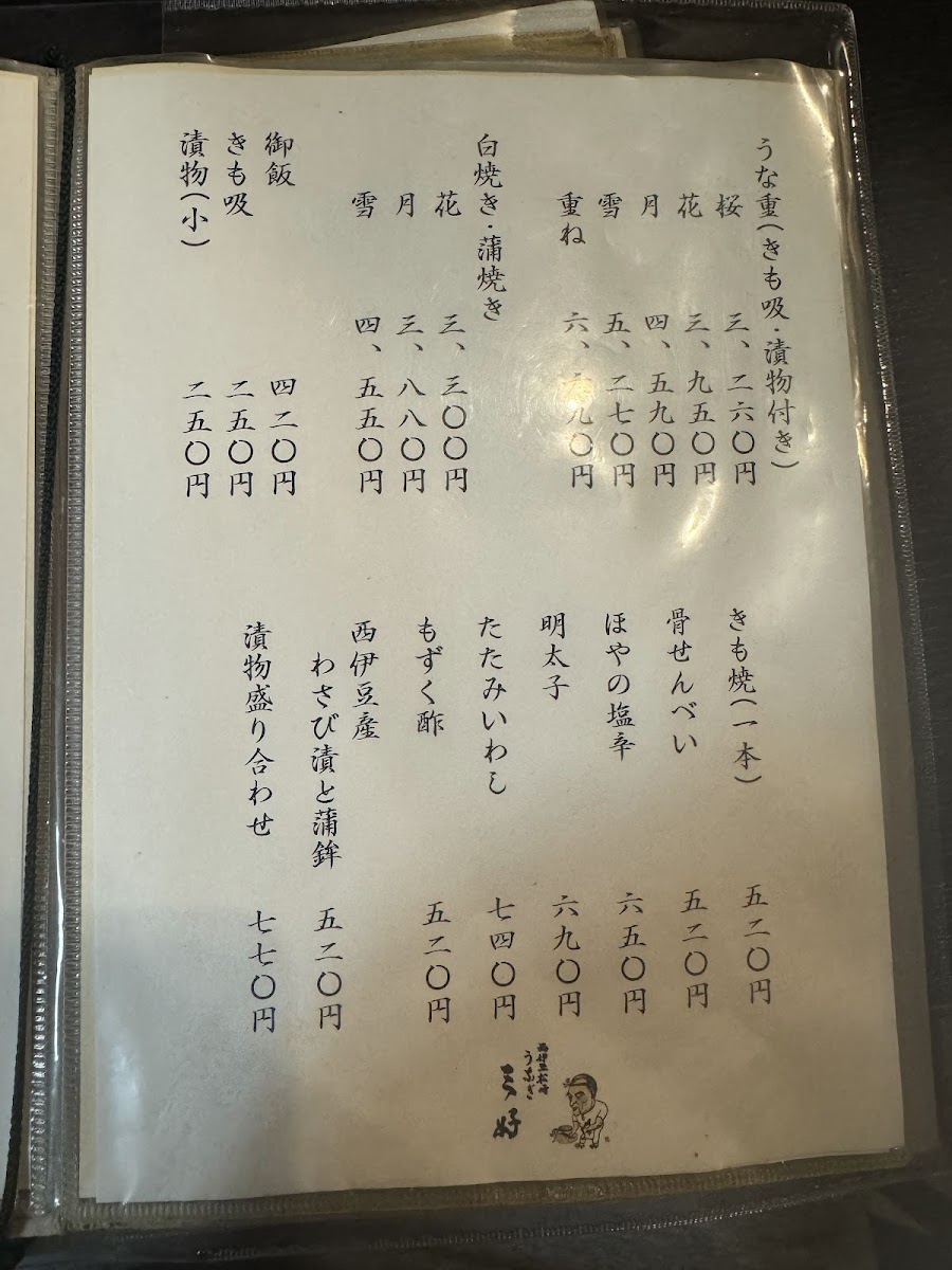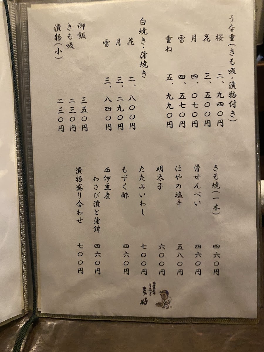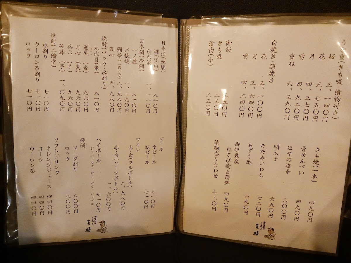 The menu at Ningyōchō Unagi Miyoshi offers a range of delicacies that highlight the restaurant's focus on eel and fresh ingredients. One of the standout dishes is the Eel Grilled Without Seasoning, which showcases the pure, smoky flavor of the eel, grilled to perfection without any heavy seasonings. For those who enjoy the richness of eel's internal flavors, the きも焼き (grilled eel liver) is a must-try, complemented by the Clear Soup Made from Eel's Livers, which adds a subtle depth to the meal.